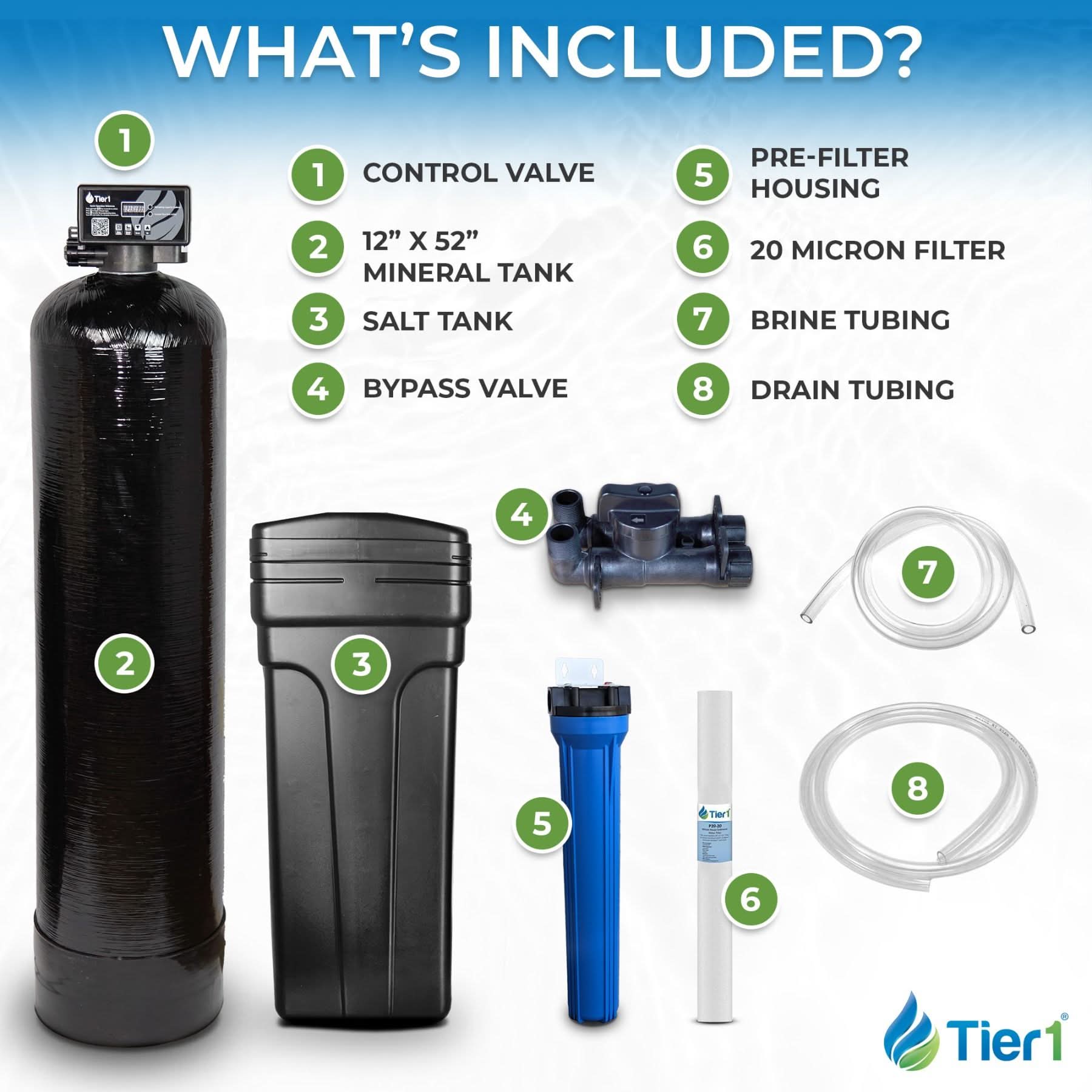 The 64,000 Grain Water Softener by Tier1 is here to help alleviate dry skin, hair, and scaling pipes due to hard water in your 4-5 bathroom home. The Tier1 Water Softener features a no-maintenance ceramic disk valve that doesn't need annual maintenance like piston, seal, and spacer valves. The efficient metered valve regenerates only when you need it and the simple programming options give you control over the full regeneration. The Softener also has a durable reinforced FRP tank, high-quality 8% cross-linked resin, and automatic bypassing during regeneration. Tier1 Water Softeners are your solution to hard water problems, order yours today!