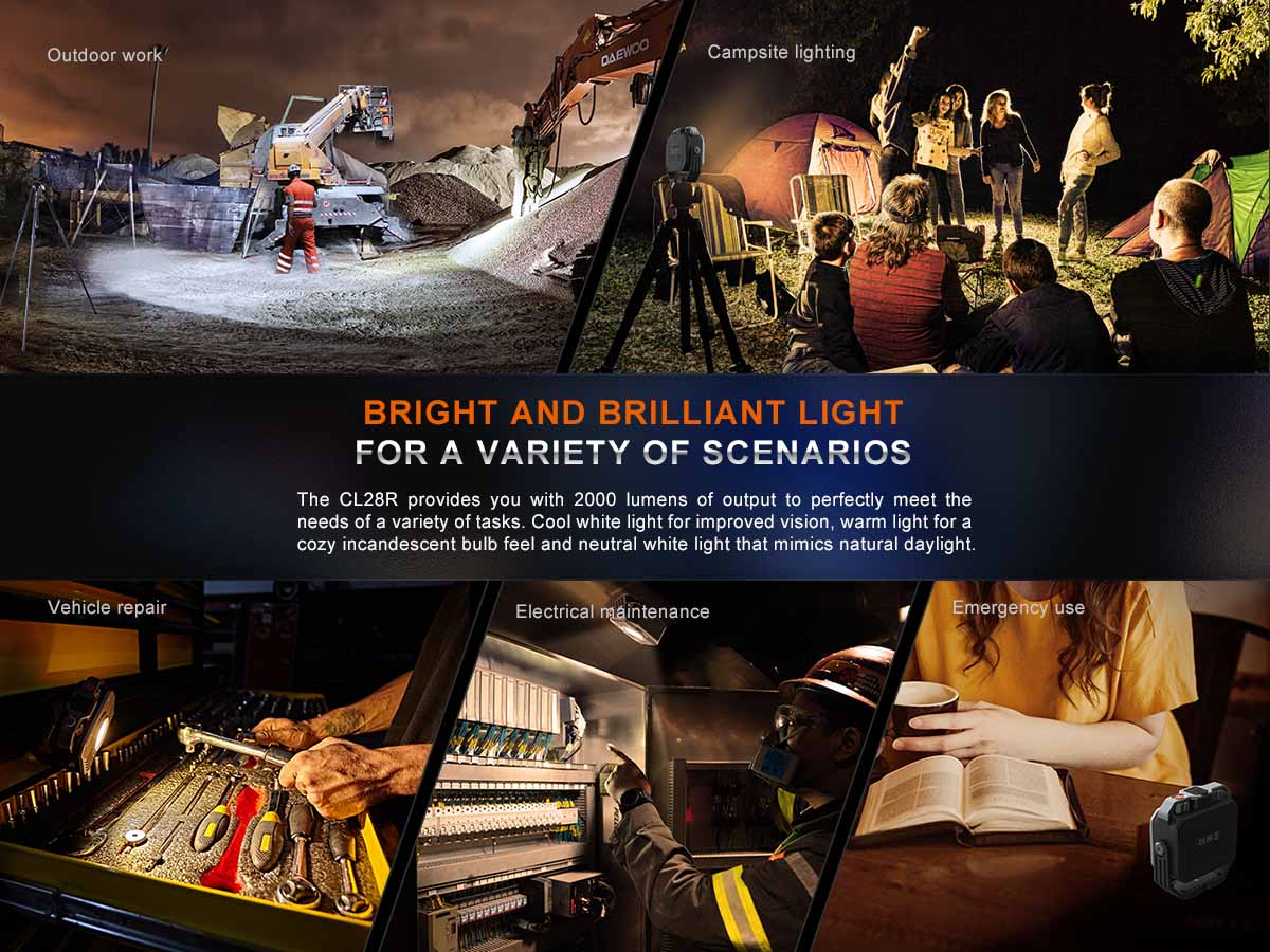 The Fenix CL28R Lantern is a powerful and versatile rechargeable lantern designed for both outdoor adventures and professional work. Featuring a high-quality LED with a 50,000-hour lifespan, it delivers up to 2000 lumens with adjustable brightness and color temperature via dual rotary switches. Equipped with two 5000mAh batteries, it offers extended runtime and USB charging capabilities. The 360° rotary handle with a magnetic base allows hands-free use, while the tripod socket adds directional lighting flexibility. Perfect for camping, photography, and emergency lighting.